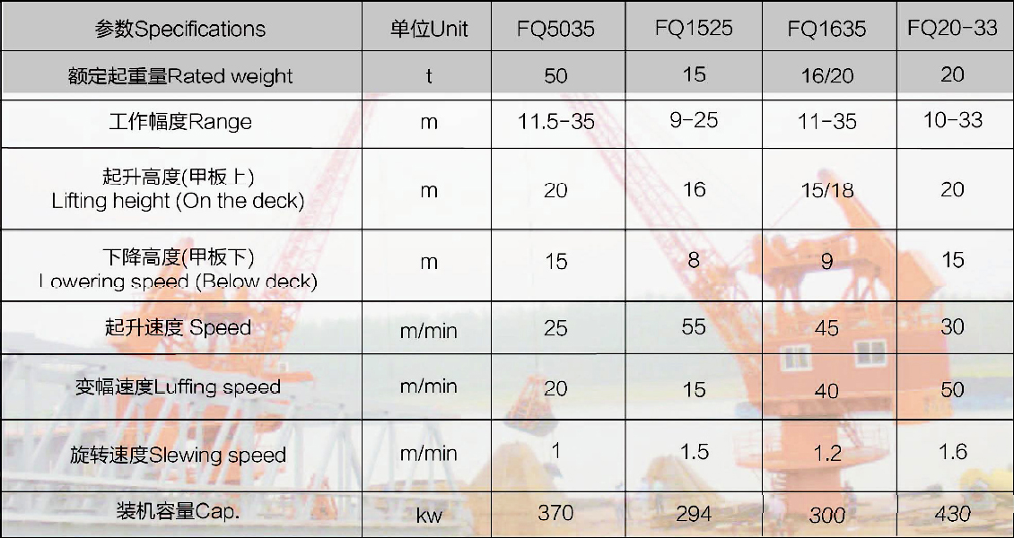 浮式起重機主要用于煤炭、礦建材料等散貨的卸船作業,或件雜貨的裝卸作業,適用于躉船上。可設計為單臂架或四連桿,貨物可做水平位移,360度旋轉,吊鉤、抓斗兩用。起升、變幅、回轉可單獨動作,也可聯合動作。