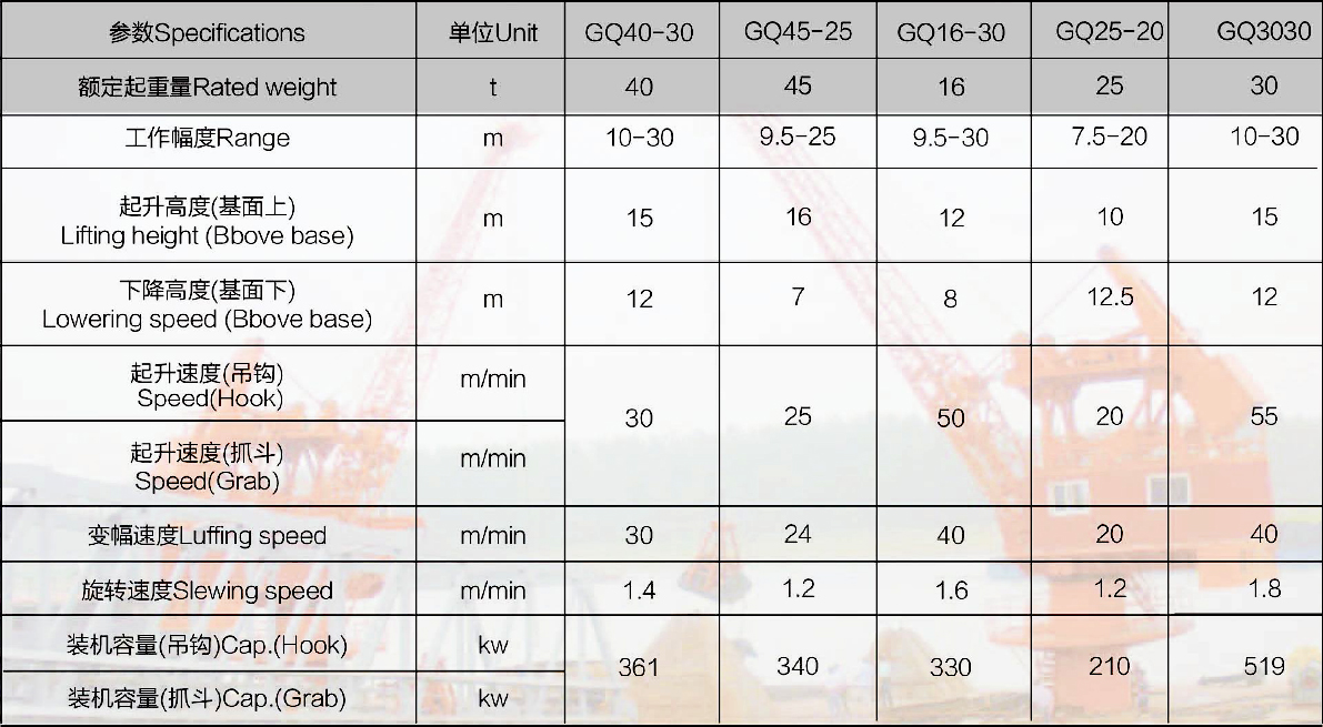 固定式港口起重機主要為單臂架式,可設計為鋼絲繩變幅或齒條變幅。貨物可做水平位移,360度旋轉。吊鉤,抓斗兩用。 固定式吊機適用于碼頭、防波堤。